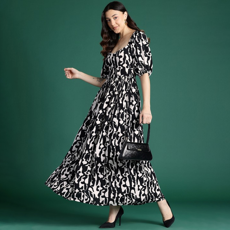 Abstract Printed Sweetheart Neck Cuffed Sleeves Gathered Tiered Georgette Maxi Dress