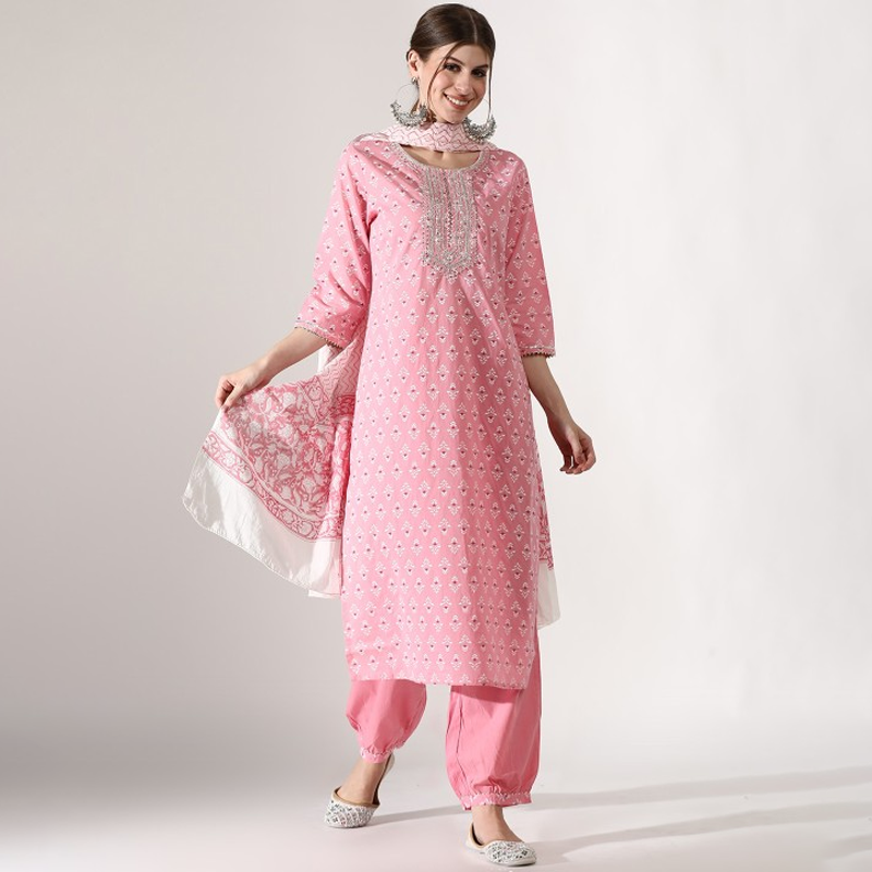 Ethnic Motifs Printed Gotta Patti Pure Cotton Straight Kurta with Salwar & Dupatta