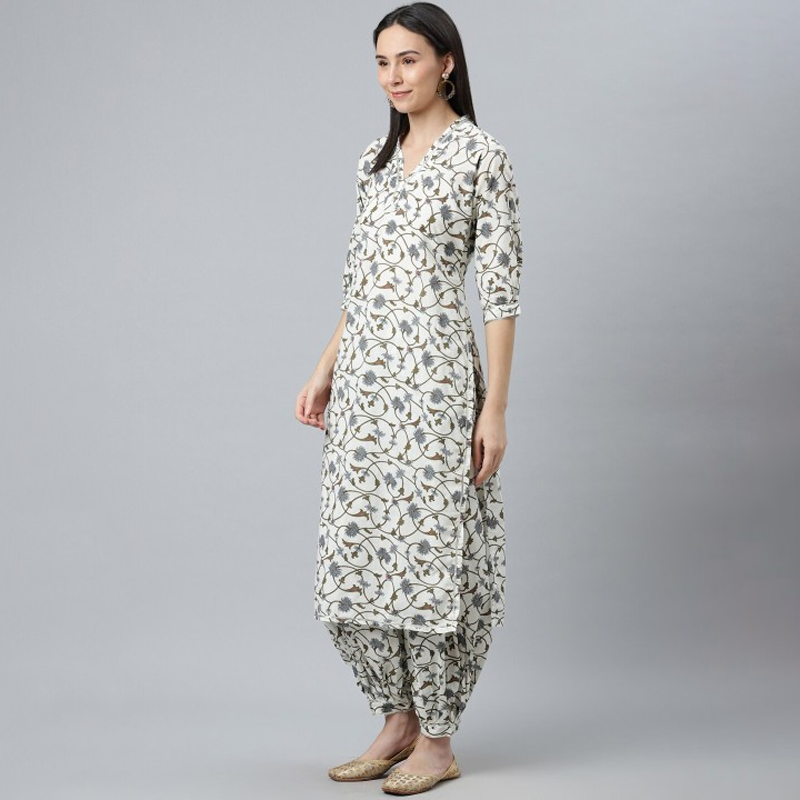 Women White Floral Printed Pure Cotton Kurta with Salwar & With Dupatta