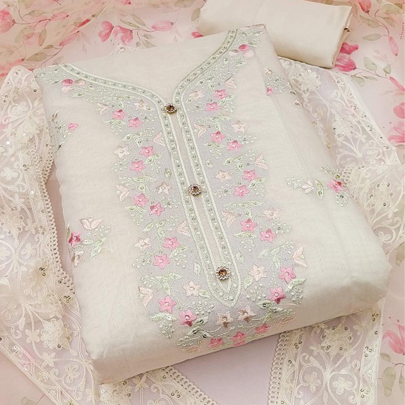 Embroidered Unstitched Kurta & Trouser With Dupatta Dress Material